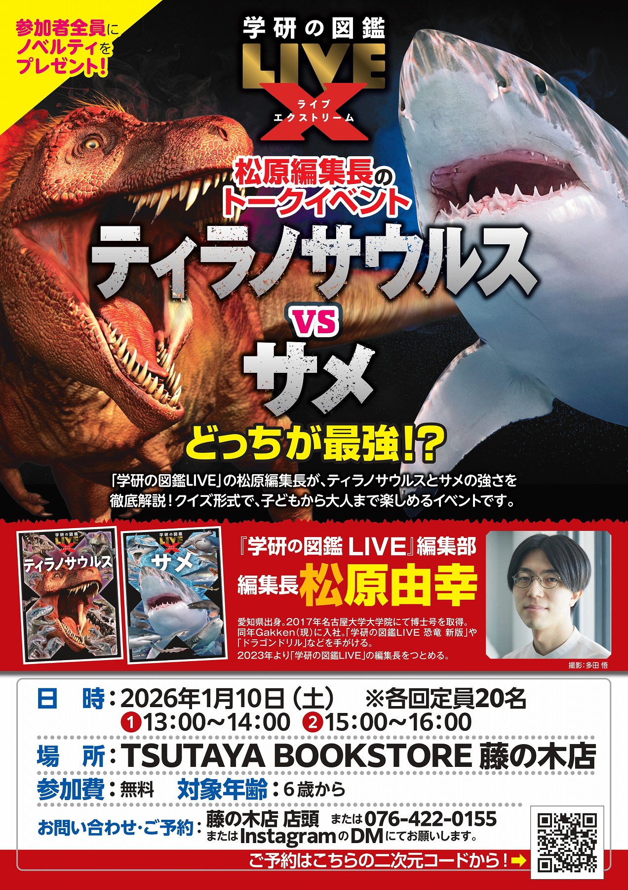 「学研の図鑑LIVE」の松原編集長が、ティラノサウルスとサメの強さを徹底解説!クイズ形式で、子どもから大人まで楽しめるイベントです。