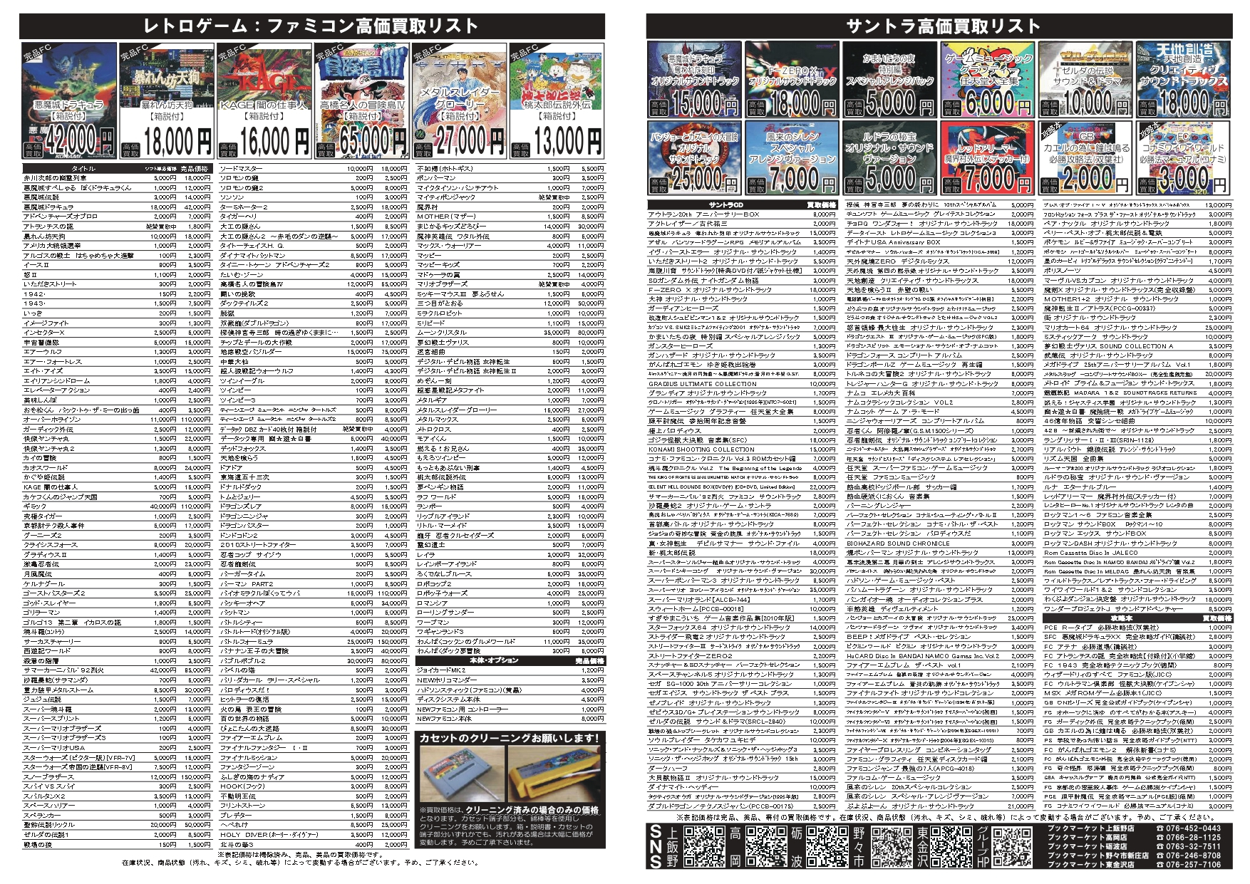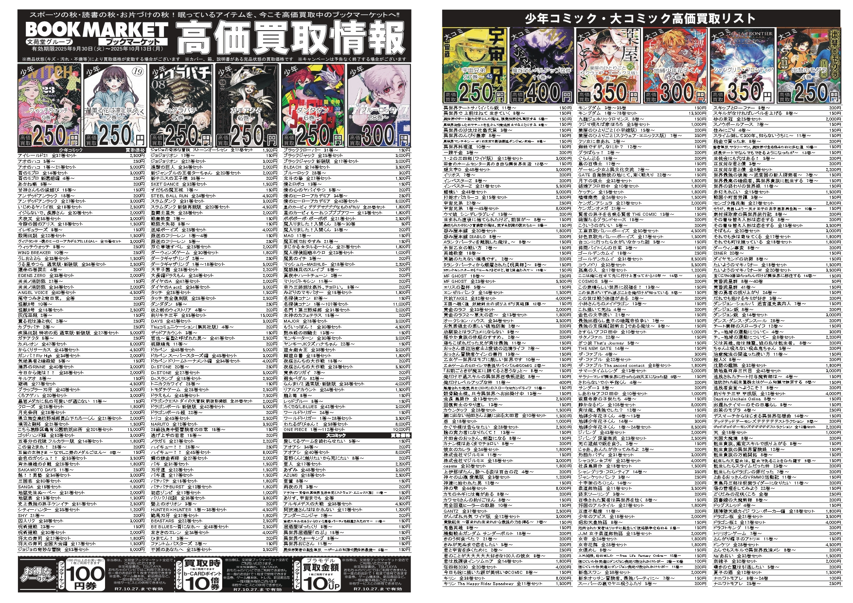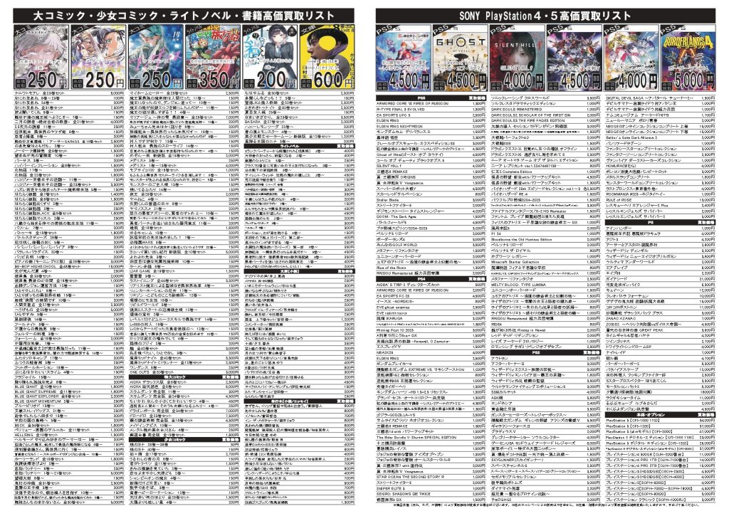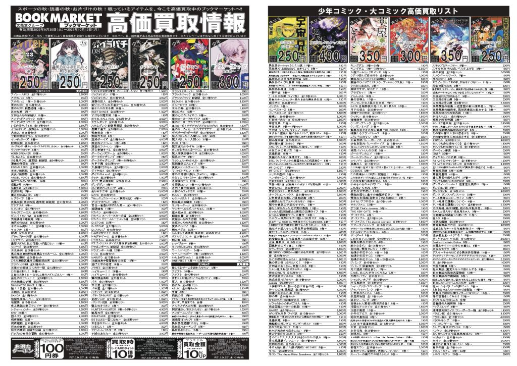 2025.09.30 ブックマーケット全店 買取情報 🍂10月前半の高価買取情報‼‼🍁レトロゲーム高価買取始めました!! 9月30日~10月13日までの高価買取情報を お知らせ致します❗❗ 今回もリサイクルマガジン全8Pの大幅パワーアップです❗❗ 通常のコミック、書籍、ゲームソフトに加え、 レトロゲーム、レトロゲームサントラを新たに追加いたしました!!!