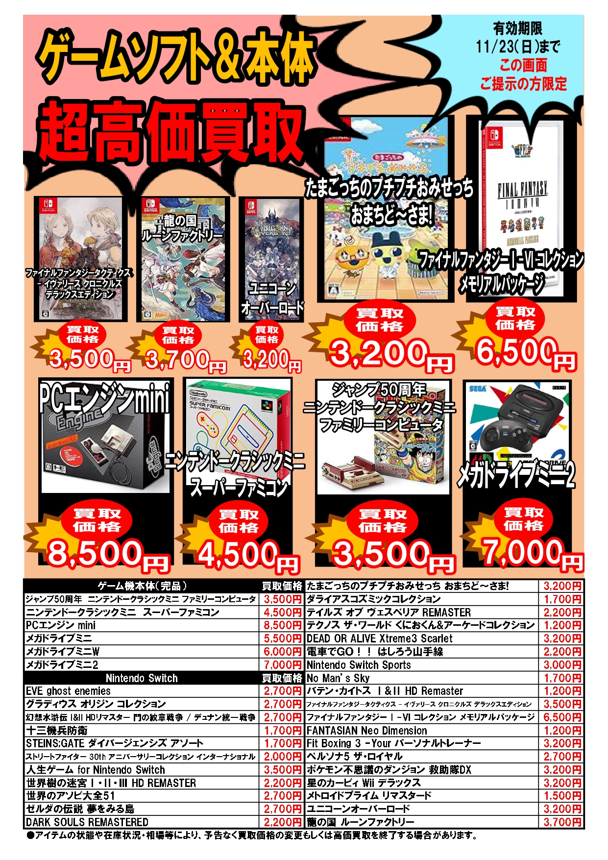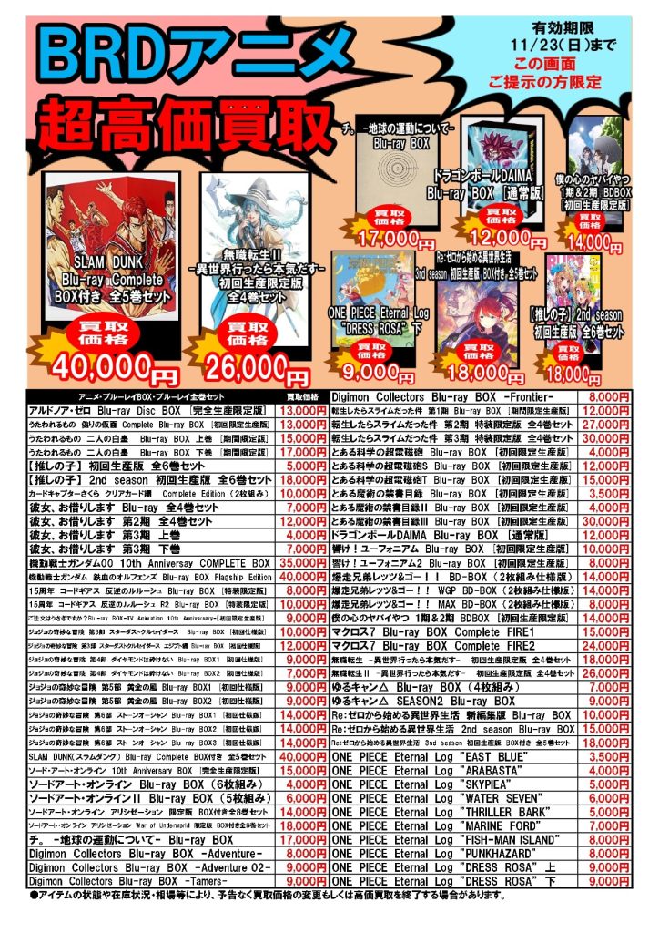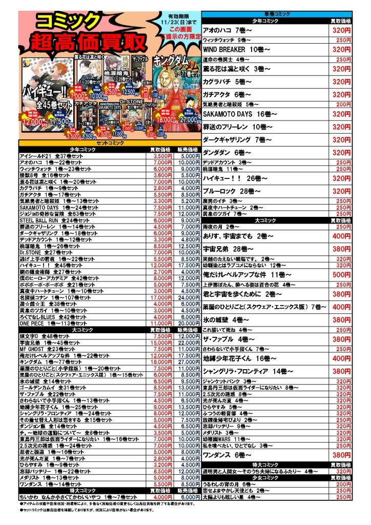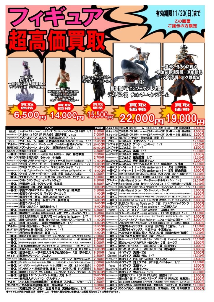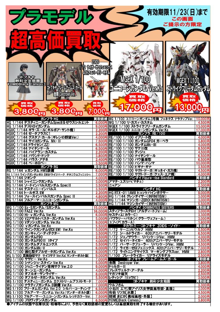 2025.11.17 ブックマーケット全店 買取情報 ⚡期間限定⚡圧倒的超高価買取情報11/17~11/23 今週の超高価買取情報はコチラ❕❕ プラモデル🤖も仲間入り! こちらのお知らせの画像か、 ブックマーケット各店Twitterの該当ツイートの画像を ご提示された方限定で、 特別価格にて買取をさせていただきます! 毎週月曜日更新ですのでお見逃しなく!!!!
