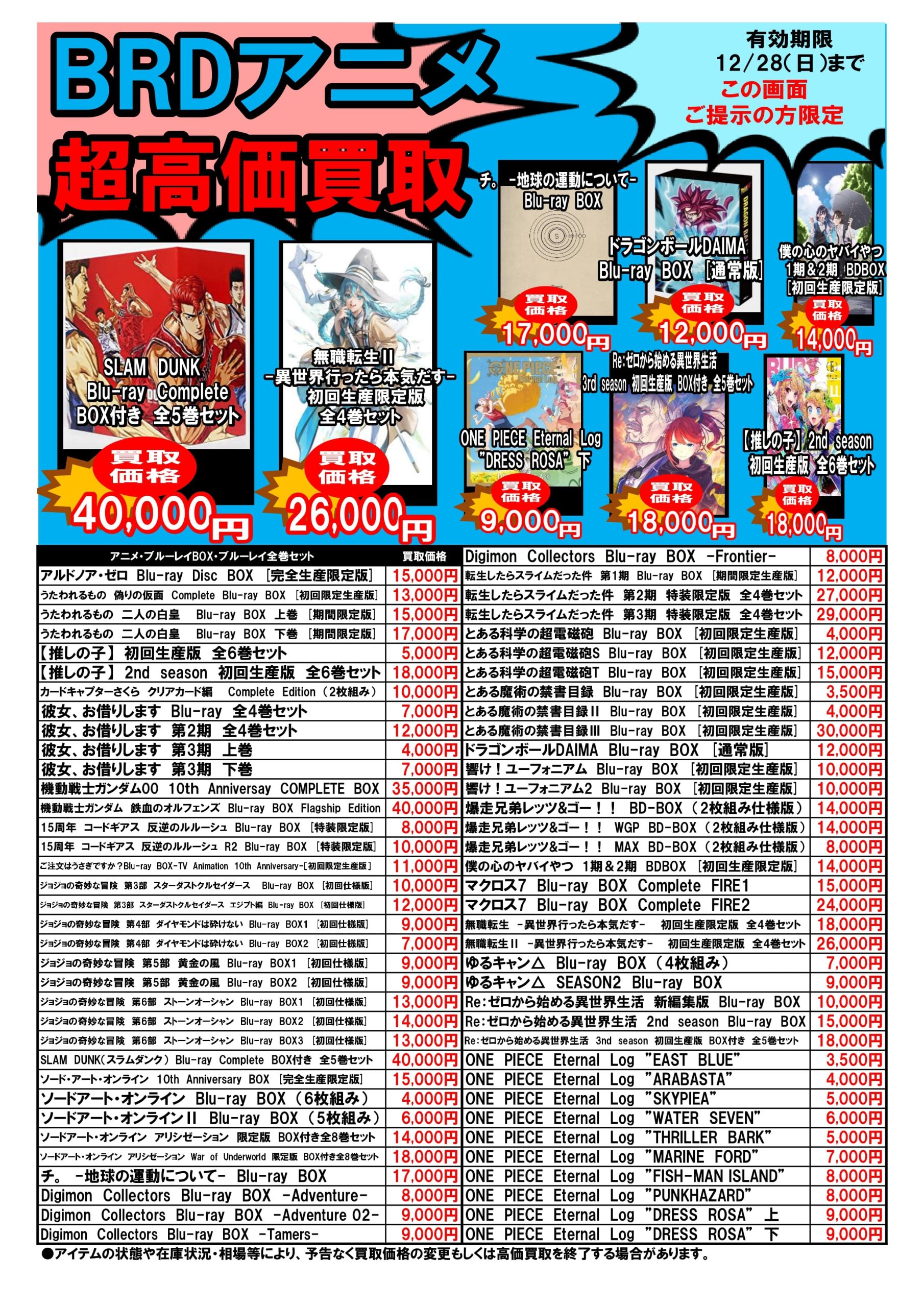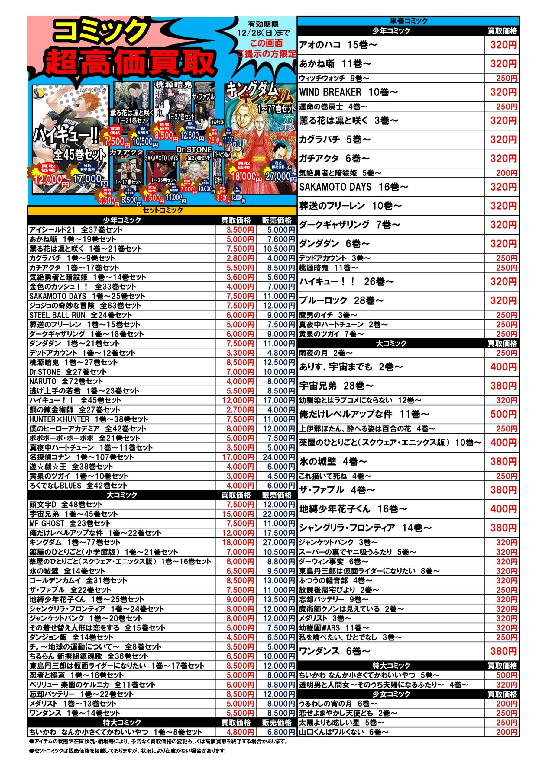 2025.12.22 ブックマーケット全店 買取情報 ⚡期間限定⚡圧倒的超高価買取情報12/22~12/28 今週の超高価買取情報はコチラ❕❕ プラモデル🤖も仲間入り! こちらのお知らせの画像か、 ブックマーケット各店Twitterの該当ツイートの画像を ご提示された方限定で、 特別価格にて買取をさせていただきます! 毎週月曜日更新ですのでお見逃しなく!!!!