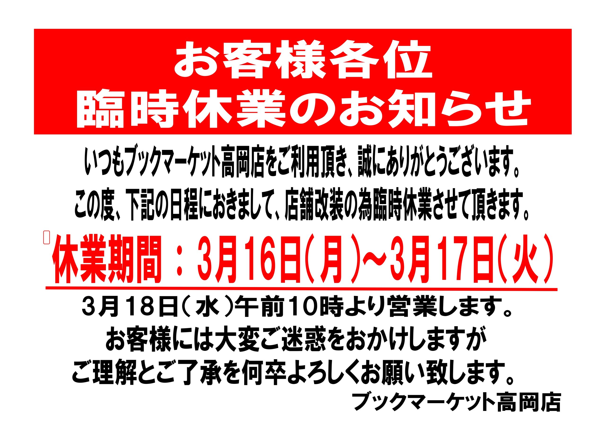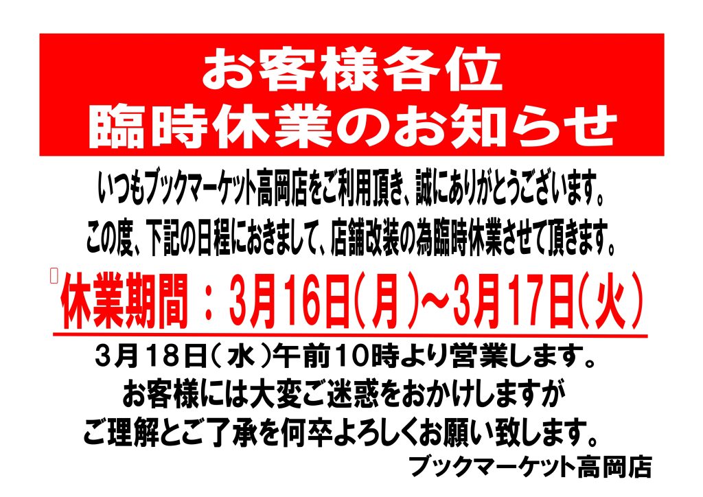 2026.03.05 ブックマーケット高岡店 お知らせ ブックマーケット高岡店臨時休業のお知らせ いつもブックマーケット高岡店をご利用頂き 誠にありがとうございます。 この度、下記日程におきまして、 店舗改装の為臨時休業させて頂きます。 休業期間 3月16日(月)~3月17日(火) お客様には大変ご迷惑をおかけしますが、 ご理解とご了承を何卒宜しくお願い致します。 ブックマーケット高岡店